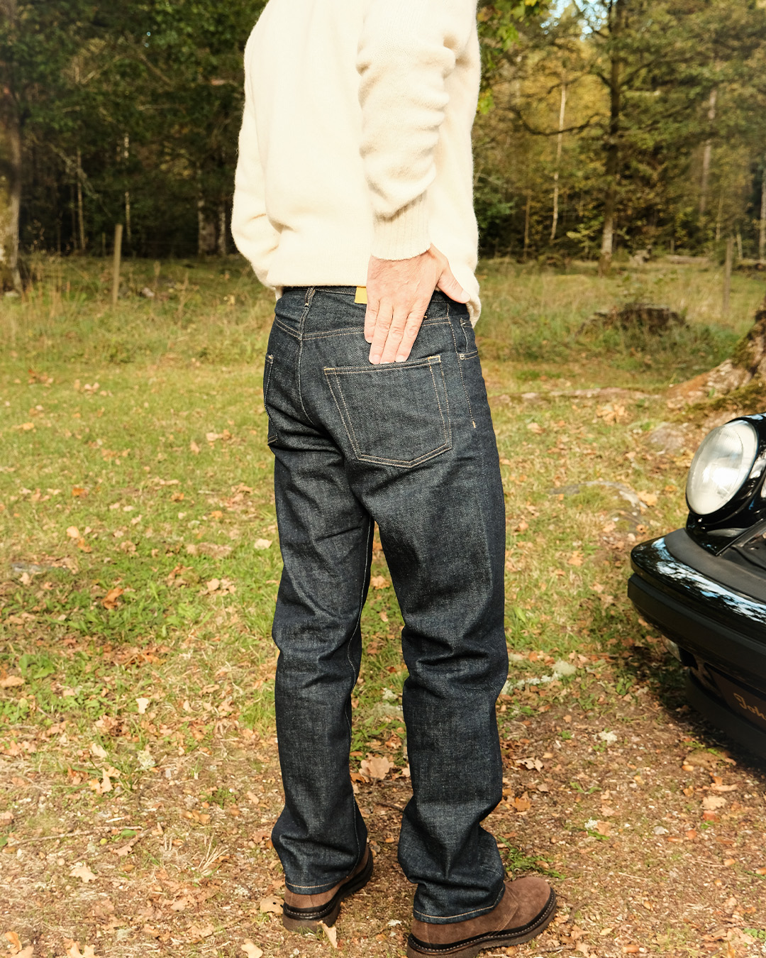 The model features classic five-pocket jeans in a dark wash, with a button fly and a suede patch at the back. The silhouette is straight and simple, making the jeans easy to wear with both a blazer and shirt or more casually with knitwear and a t-shirt. One of our key looks for the season is paired with the V-neck sweater from Harley of Scotland and black loafers from Myrqvist x Tärnsjö Garveri.