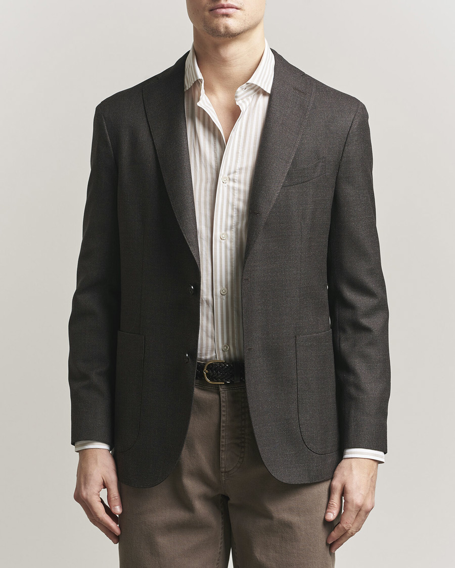 Sakko von Lardini mit einem Fischgrätenmuster. Seit Ende der 70er Jahre verbindet das italienische Luxuslabel traditionelles Handwerk mit modernen und innovativen Produktionsmethoden. Die Mäntel und Blazer der Marke zeichnen sich durch klassisches Design, anspruchsvolle Qualität, sowie eine perfektionierte Handwerkskunst aus.